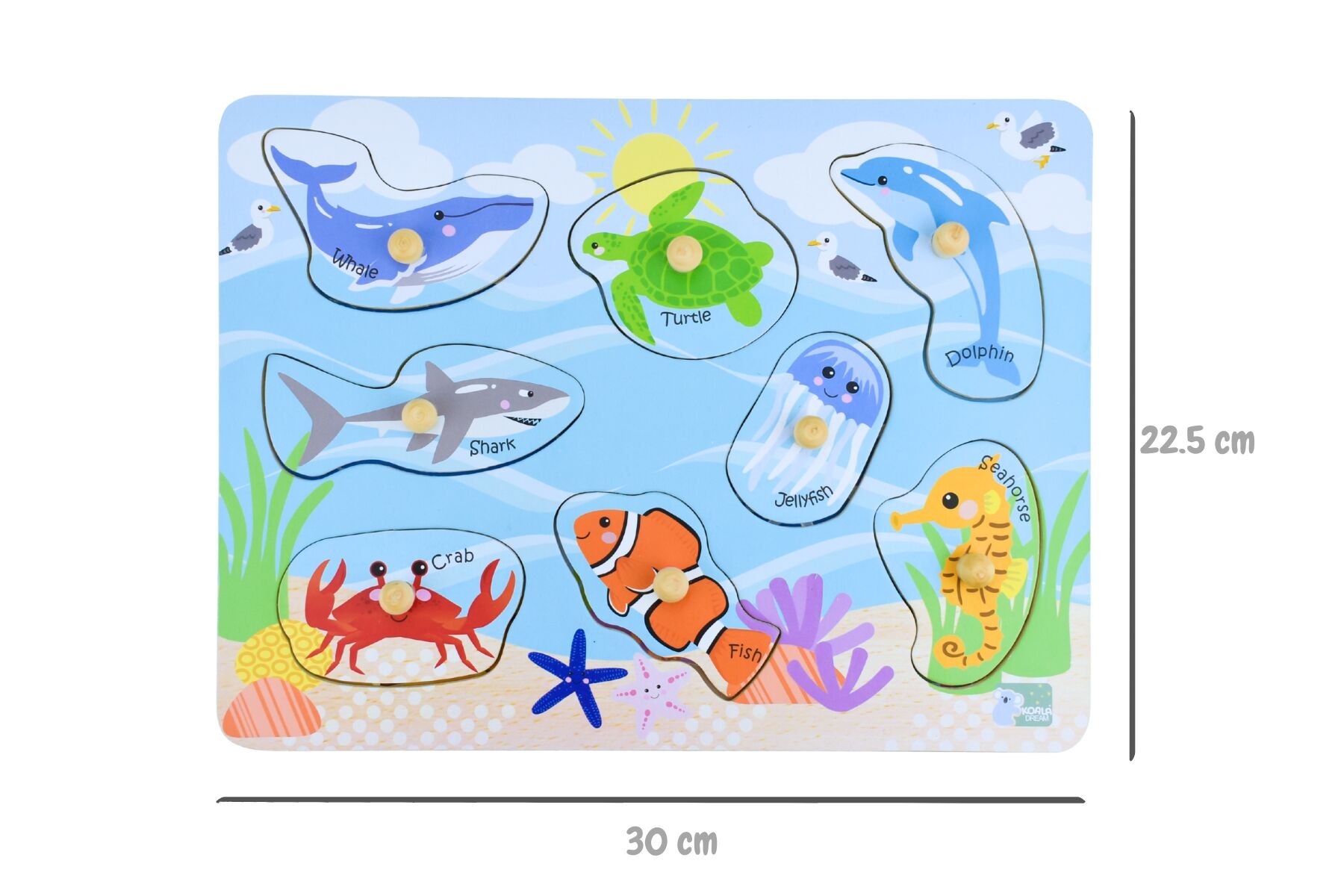 Introducing the 2 in 1 Sea Animal and Their Habitats Peg Puzzle by Koala Dream, an engaging and educational toy that takes children on an exciting journey beneath the waves. This peg puzzle features nine captivating sea animals, including whale, turtle, dolphin, shark, jellyfish, crab, fish and seahorse. As children lift each animal-shaped puzzle piece, they uncover a fascinating underwater environment in which the sea creature lives. Whether its rockpools, coral reefs, estuaries, or the vast open sea, each animal is associated with a unique habitat. This interactive feature allows children to explore and learn about different marine ecosystems while discovering the diversity of sea life. The 2 in 1 Sea Animal Peg Puzzle encourages imaginative play and fosters a love for marine life. Children can dive into the world of sea creatures as they match each animal to its corresponding habitat. Through hands-on exploration, they develop important cognitive and fine motor skills while expanding their knowledge of the underwater world. Crafted with attention to detail, the 2 in 1 Sea Animal and Their Habitats Peg Puzzle by Koala Dream showcases vibrant colours and durable construction, ensuring long-lasting enjoyment. The wooden pegs attached to each puzzle piece make it easy for little hands to grip and lift, promoting dexterity and hand-eye coordination.