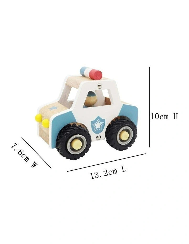 Waa Waa Waa Waa. Watch out, the police car needs to get by and rescue someone stuck in a well! Kids will play for hours with this sturdy wooden police car with rubber wheels to protect surfaces. With a sturdy frame made from natural beech wood and non-toxic paint, this police car will put up withthe rough and tumble of play