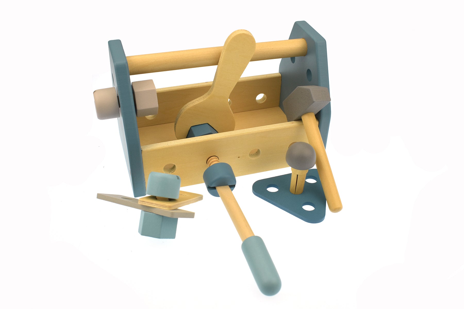 A wooden toolbox with 14 pieces including hammer, spanner, nuts, bolts and plates to keep your child busy for hours. Made with good quality natural wood and non-toxic paint. Helps with hand and eye coordination.