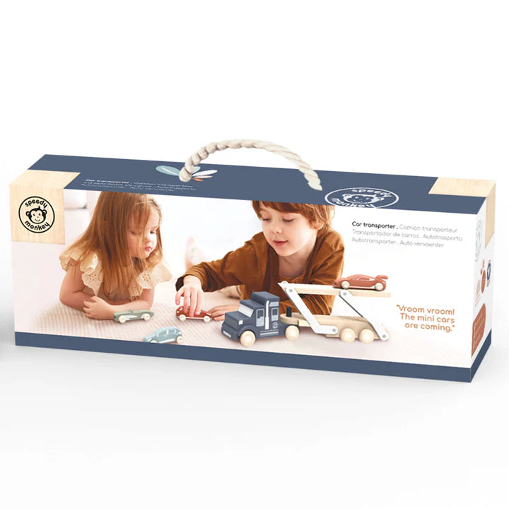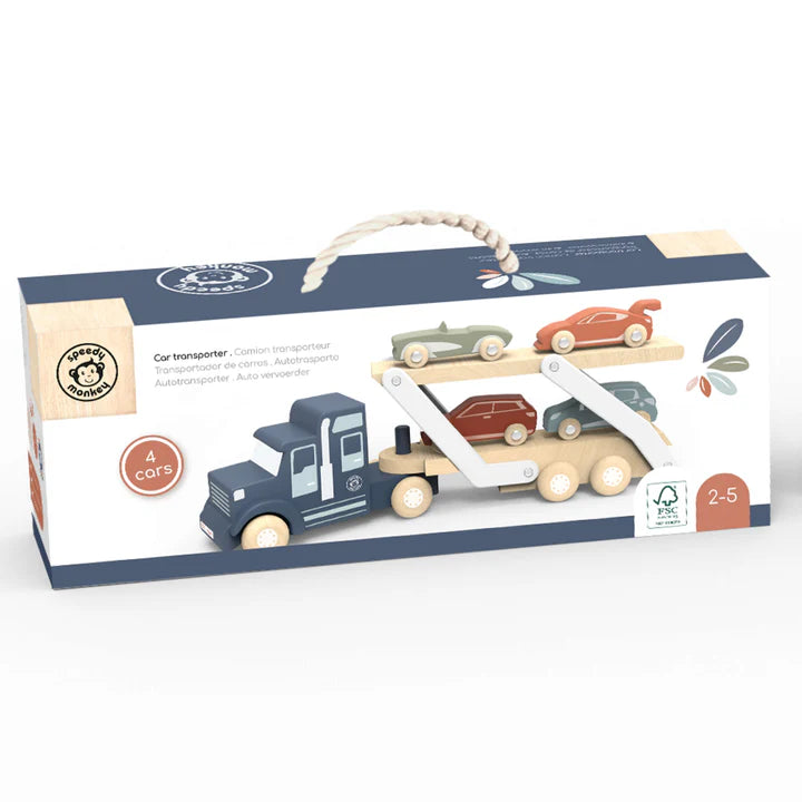 A fun wooden pull-along train stacker, painted in gorgeous soft colours and featuring our favourite character, the monkey. Little ones will have hours of fun, building and stacking blocks on the train and building houses with colourful blocks.