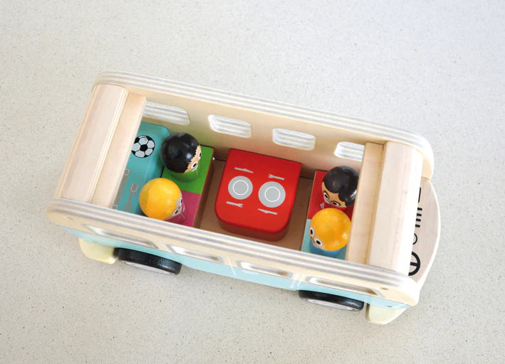 A retro camper van complete with wooden peg family and dog. Made from durable rubber wood with an attractive paint work finish, the camper van has a removable roof to allow easy access to the inside where the peg people can be put into their matching coloured seats.