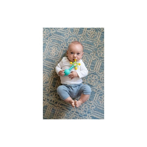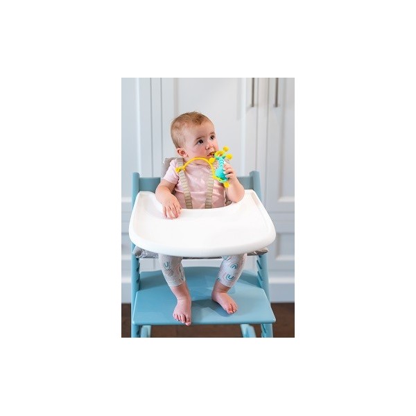 Gumlii is an easy to hold sensory teether with textured chewy nubs and a gentle rattle sound. Gumlii encourages and supports sensory exploration and midline play. Gumlii also comes with an attachable tether. Made from 100% food grade silicone. BPA & Phthalate free