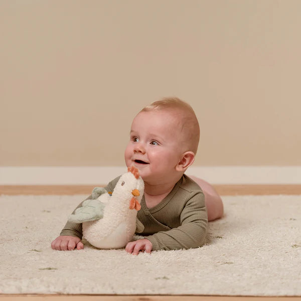 Cluck, cluck, cluck. This cute chicken from the Little Farm collection can’t stop playing! You can push it away, but it always comes back for more fun. This chicken wobbles from side to side when pushed over and makes a tinkling sound. The tumbler is designed to promote motor skills in a playful way. Children will love giving it a push and seeing it sway. Guaranteed to bring lots of giggles!