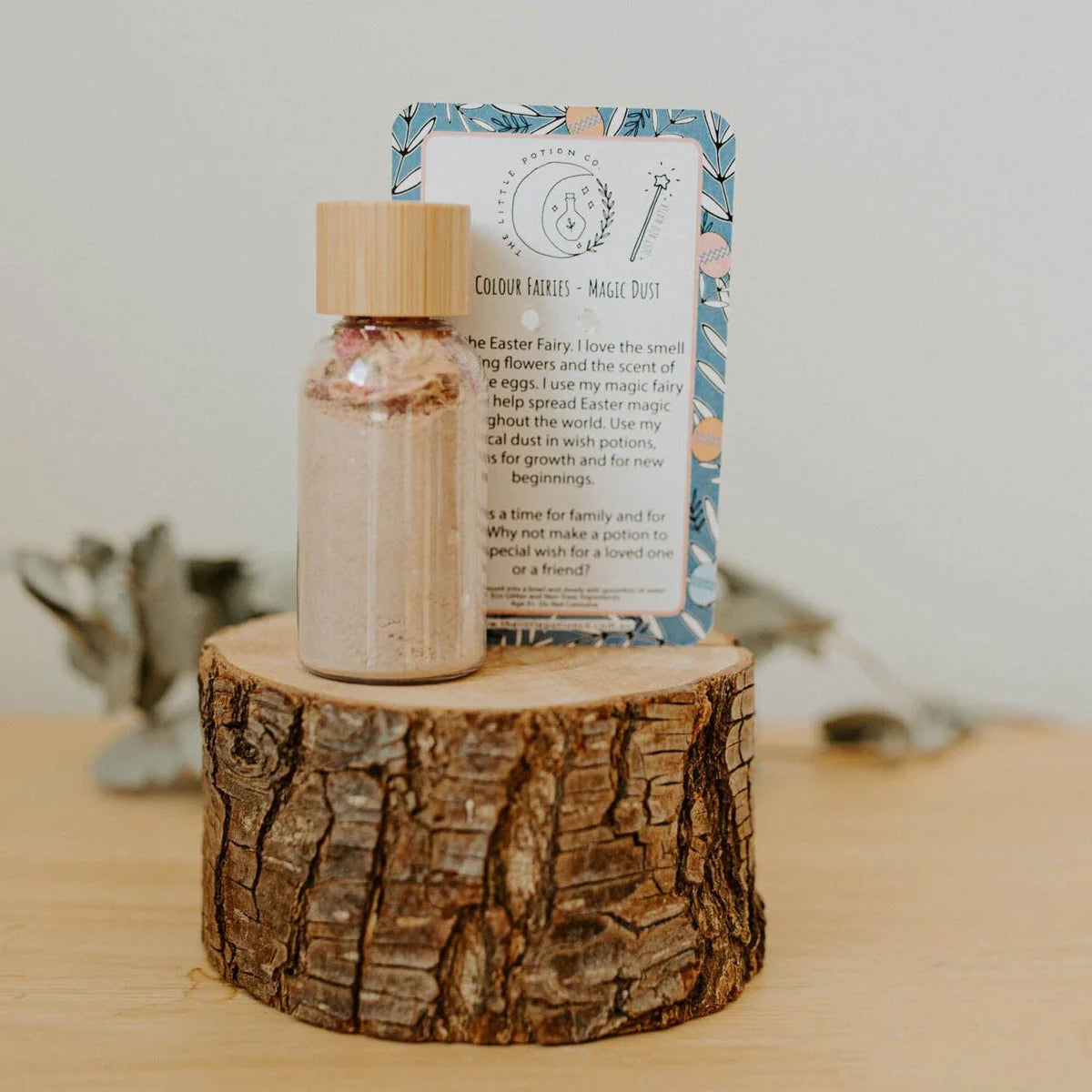 I am the Easter Fairy. I love the smell of spring flowers and the scent of chocolate eggs. I use my magic fairy dust to help spread Easter magic throughout the world. Use my magical dust in wish potions, potions for growth and for new beginnings. The perfect Sugar-free Easter gift. Add this magic dust to your potion making for extra fizz, sparkle and magic. For optimum fizz, slowly add teaspoons of water to the magic dust in a small bowl. Contains: Fizzing ingredient in 30ml PET plastic bottle with a bamboo cap. Ingredients: Bicarb, citric acid, coco, mica and biodegradable glitter .