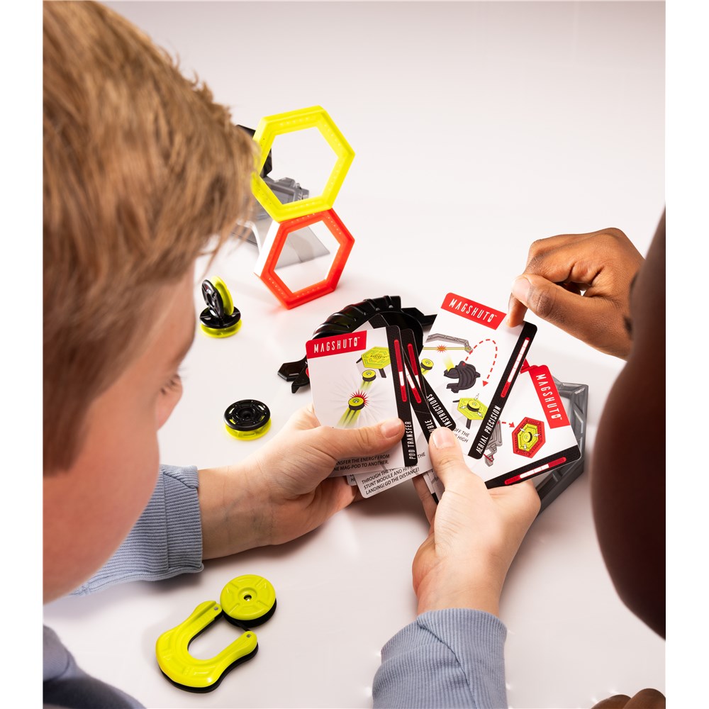 Ricocheting, rebounding, flipping, colliding, flying, tunnel-gliding, and more... Take on the 15 included challenges. Invent your own stunts. Combine with other Magshuto sets and incorporate your environment.