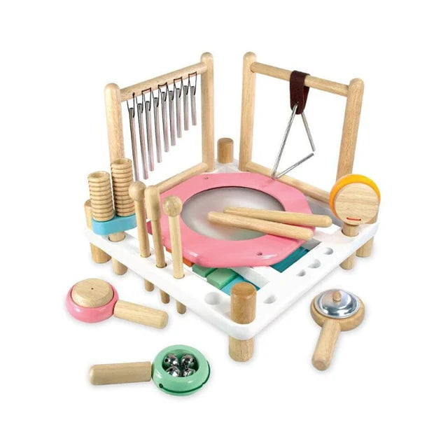 Features 10 different sound and music experiences in a sturdy rubberwood frame. Includes xylophone, drum, tubular chimes, triangle, cymbal, bells, maracas, castanet, double guiro, and pair of rhythm sticks plus 2 strikers and 1 scraper. Every part is stored in its own dedicated slot around the frame but can be flat packed for easy storage. Flip the main frame to reveal a colouful drum. Produced from sustainable rubber wood and finished with non toxic child safe paints and laquers.