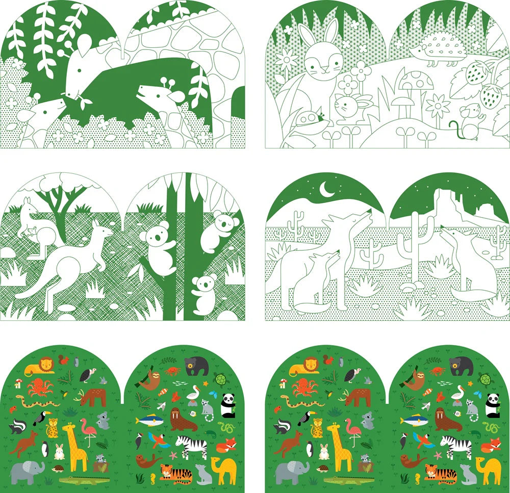 Colour in the exotic safari scenes featuring giraffes, elephants, and monkeys, and more, and once you're done decorate them with over 100 jungle-themed stickers!