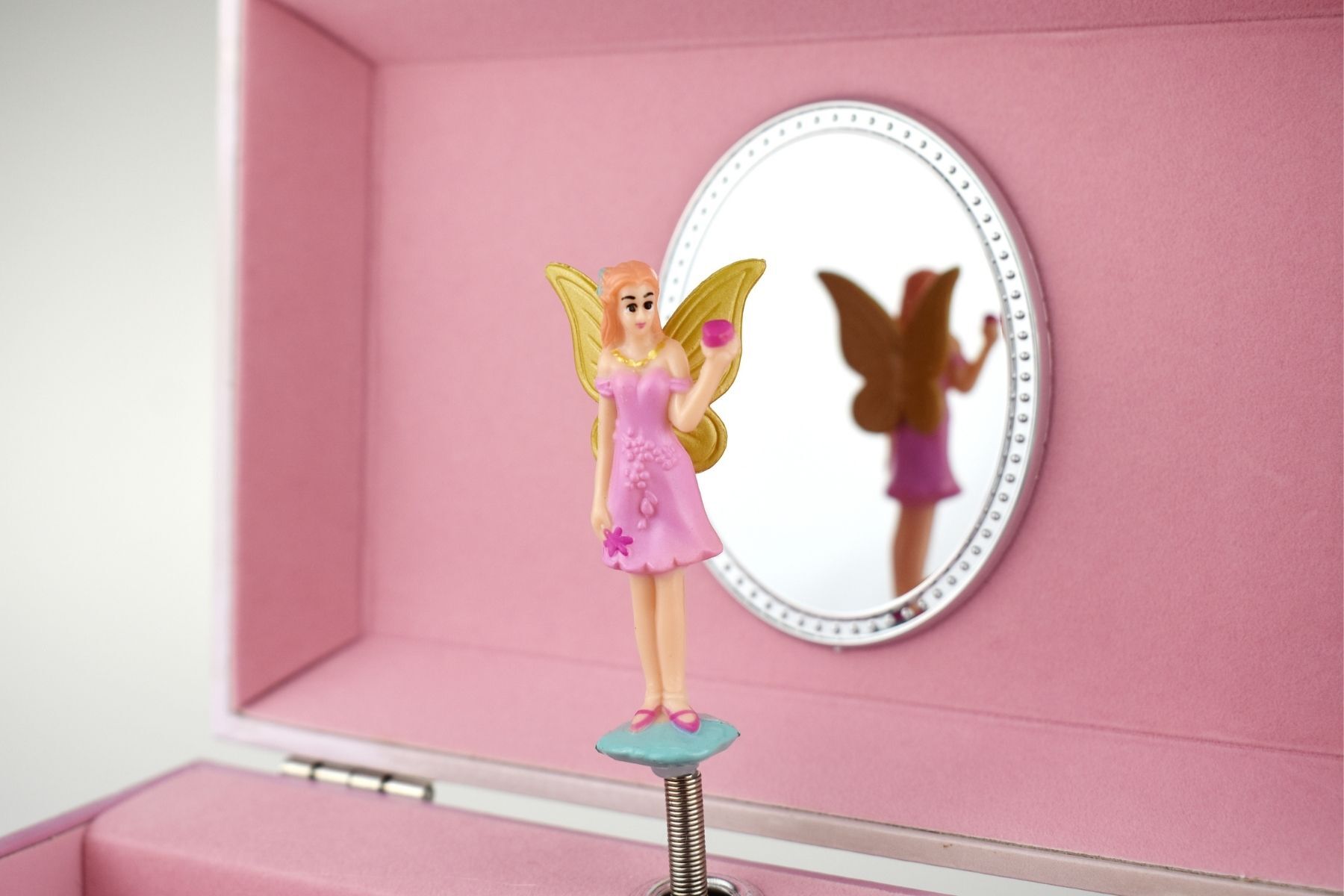 Children will love this magical musical jewellery box from Kaper Kidz. It is sure to put a smile on their faces when they open the lid as they watch the Fairy twirl to the music playing within. Each jewellery box is covered in beautifully illustrated pictures of dancers, ballerinas and more so you can proudly display this jewellery box on any shelf or table. On the back of each box is a small handle that can be wound up to play the music hidden within the jewellery box. The music will only play once the lid is opened and the figurine will spin along to its tune. Each box has been flocked inside with soft velvet fabric , to keep precious things safe . Behind the spinning figurine, a mirror features to show off the figurine as it spins. This music box plays to the tune dance of the Sugar Plum Fairy. Each musical Jewellery Box from Kaper Kidz is designed as a decorative object for sorting, storing and displaying precious items.