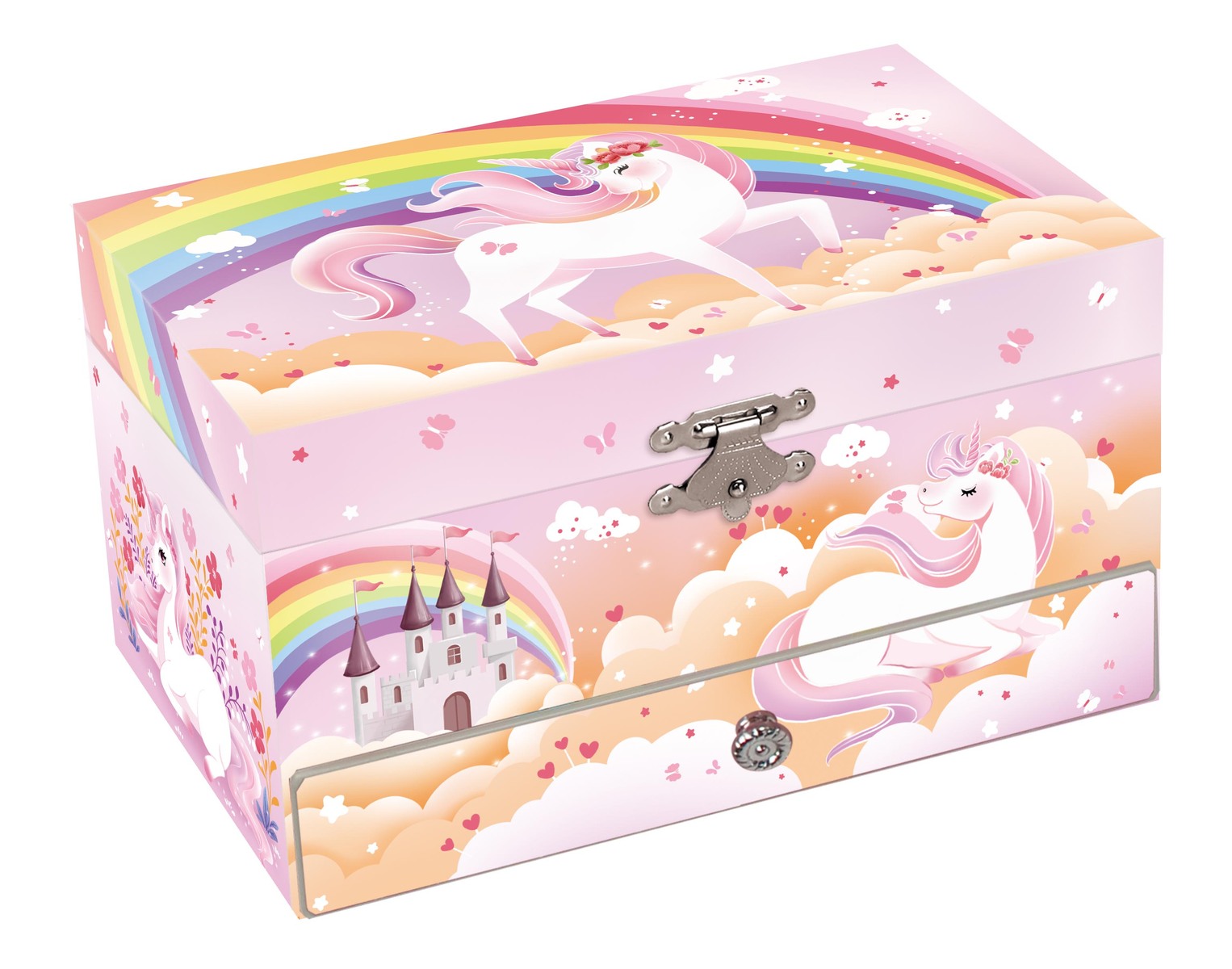 The inside is lined with soft velvet, offering a cozy haven for precious treasures, while a sparkling mirror reflects the joyous dance of the unicorn, making every twirl even more enchanting. With a handy pull out drawer for storing secrets and treasures, this music box is more than just a decorative object, it is a cherished companion for sorting, storing, and showcasing all things special.