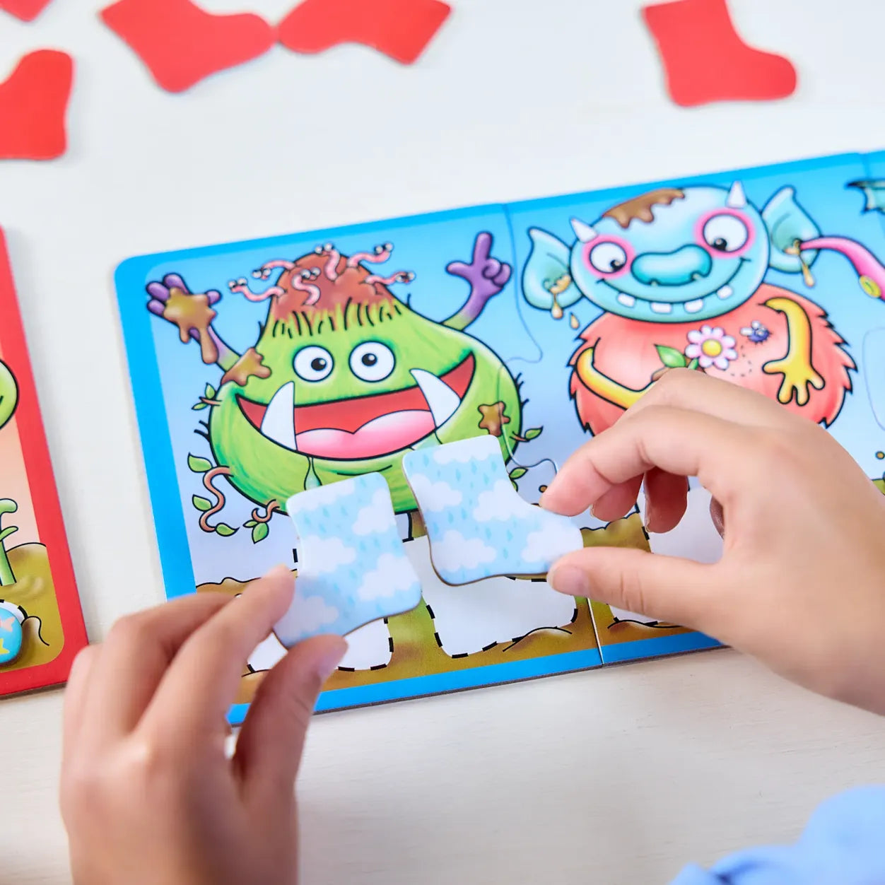 Turn over welly cards to find matching pairs of wellies for your monsters. The first player to fill their board wins!